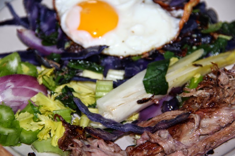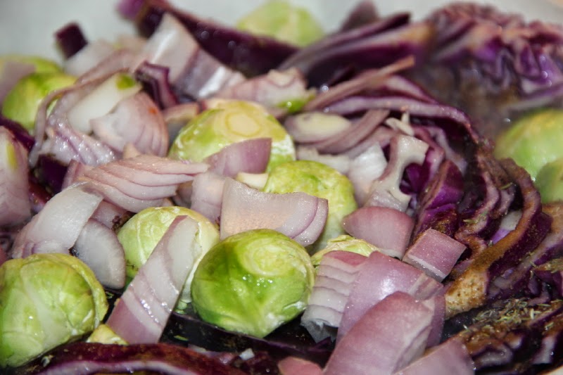Servert på en seng av stekte grønnsaker: Rødkål, rødløk og rosenkål.