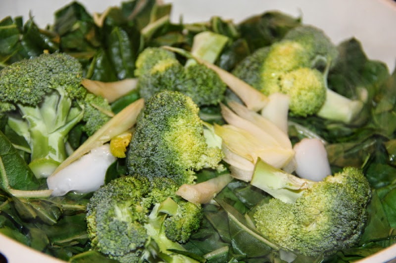 Brokkoli, fennikel, hvitløk og mangoldblader (det grønne) med kokosmelk som tilbehør.